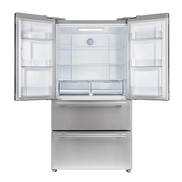 Discover the Forno 36” Moena French door frost-free refrigerator - a technological marvel with a 19.2 Cu.Ft. capacity. Enjoy precise temperature control to keep your food and beverages at their best. The LED touch panel grants easy access to all features. Organize your fresh food in the 12.12 cu.ft. section, featuring adjustable glass shelves, 2 crisper drawers, 2 door bins, and 1 gallon bin for added storage. Access the 7.14 cu.ft. freezer with two pull-out drawers effortlessly. With Forno's superior design, your food stays organized and fresh. Backed by a 2-year warranty and an E-star energy rating, Forno provides quality without the hefty price tag. Lower your cost of living while elevating your refrigeration experience.