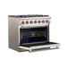 The Forno Capriasca 36 Inch Gas Range enhances your home kitchen with professional styling and performance through its durable and beautiful 304-grade stainless-steel design. The cooking surface features 6 sealed dual-ring brass burners, totaling 120,000 BTU. All burners, each at 20,000 BTU, can simmer precisely at 1,000 BTU. Continuous heavy-duty cast-iron grates facilitate easy sliding of pots or pans off heat over the enamel cooktop cavity, simplifying spill cleanup. The 5.36 cu. ft. gas oven, with a 30,000 BTU output and infrared red mesh broiler, enclosed in a blue enamel interior, offers optional convection for precise, and consistent cooking on multiple levels. For convenient viewing, a 3-layer glass oven door window is included. The package includes 3 telescopic stainless-steel oven racks, wok support, and an LP conversion kit. Additionally, zinc-coated illuminated metal knobs with bezel rings ensure enduring beauty.