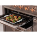 The AGA Elise 48" Dual Fuel Model features three separate ovens. The first is an electric multifunction oven with seven settings including true European dual-convection cooking, fan-assisted baking, browning, thaw and serve, convection broiling, warming, and conventional cooking. A second European convection oven offers the ability to cook multiple large dishes at once using differing heating modes and temperatures, while a third dedicated glide-out broil oven allows for dedicated top-heat broiling. A continuous cast-iron cooktop features five powerful sealed-brass burners providing easy cleanup and preventing messy spills from reaching the oven or internal components. A storage drawer stores extra racks and trays.
