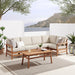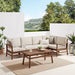 The simple yet trend-setting silhouette of this sectional will set your space apart, whether it’s sitting by the pool or around the fire pit. Sleek and sustainable solid acacia wood frames make up a sturdy, long-wearing base, and upholstered cushioned and backrests top off this set with a comfy place to sit and chat for hours. Host fun drinks, snacks, and marshmallow-roasting essentials atop the sturdy, solid wood coffee table while you gather ‘round and enjoy the company of your favorite people or even furry friends.