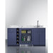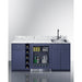 The Oasis Wet Bar is a 68.5" wide home wet bar in a midnight navy finish, sized just under 34" to comply with ADA guidelines for lower counter height. It features hardwood construction, a stainless steel sink with a faucet, and a pre-installed countertop made from a water-resistant laminate material with a marble look. We include a matching backsplash for optional use. To maximize storage, this model has two cabinets, a spacious drawer, and a wine cubby designed to hold five wine bottles. We also supply the door knobs in an attractive brushed nickel finish. The pre-assembled cabinetry comes in a modern slab style. For this same unit with the sink positioned on the left side, see model OASISMN33SINKL.