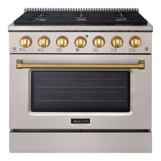 View full detailsAkicon 36" Slide-in Freestanding Professional Style Gas Range with 5.2 Cu. Ft. Oven, 6 Burners, Convection Fan, Cast Iron Grates. Stainless Steel & Gold