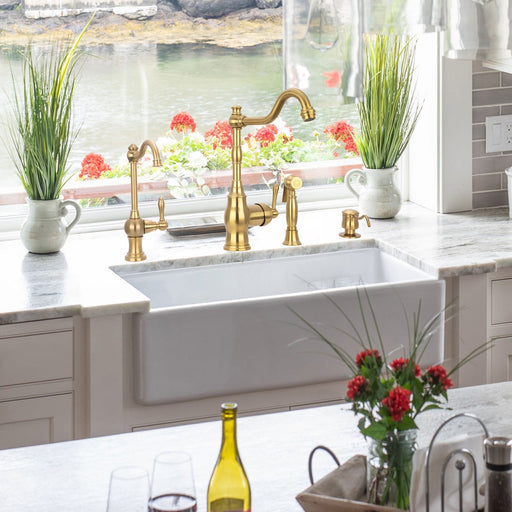 View full detailsOne-Handle Brushed Gold Widespread Kitchen Faucet with Side Sprayer - AK96918-BTG