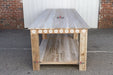 An impressive ten feet large table with thick square legs and a lower shelf. Made from reclaimed teak, this large reconstructed table has a sun bleached finish with a beautiful inlay work in a floral motif. This table features blossom inlay designs across all the apron on all sides of the table. This table has six thick square legs and lower shelf. Our blossom mother of pearl inlay collection is inspired by the opening of a lotus flower which is a symbol of purity and enlightenment. This reclaimed teak table is hand-carved forming the flower shape, the inlay pieces are cut and carefully hammered into the wood to create the lovely lotus design.